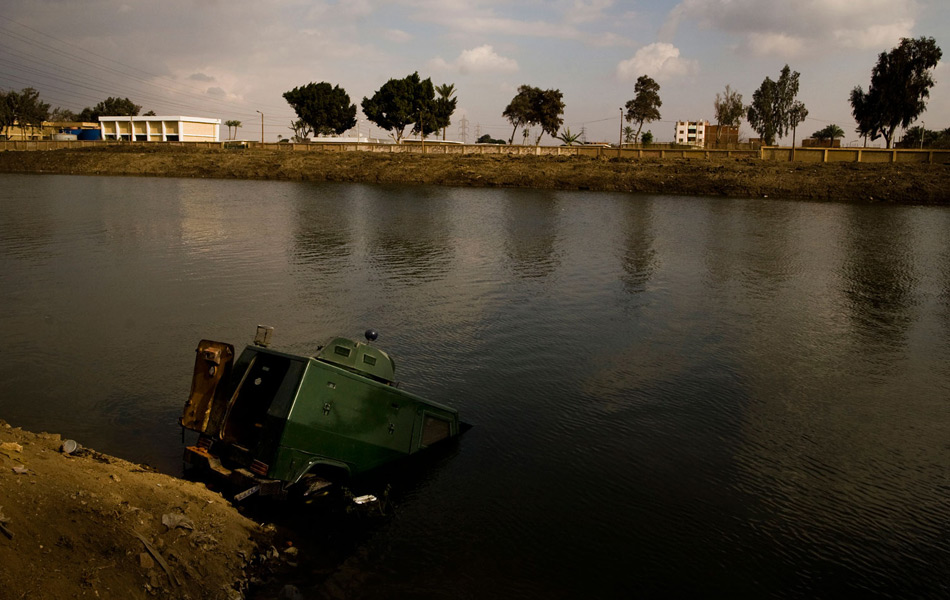 当地时间2011年1月31日,埃及开罗市郊,一辆被叛乱囚犯抢劫征用的警用运输车被遗弃在河里。 Dominic Nahr/摄