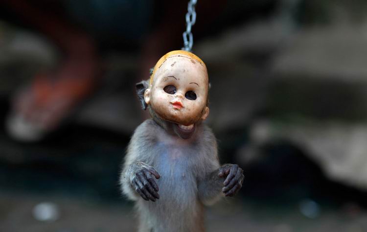 当地时间2011年4月25日,印尼雅加达,一只带着面具的猴子在街头表演猴面舞。训猴人Karmini称,他的四只猴子通过表演舞蹈,每天可以为他带来10美元的收入。 Beawiharta/摄