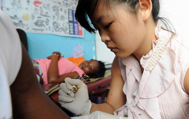 一名中国女子为当地人纹身。
