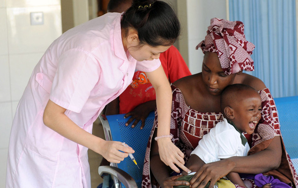 巴塔市,私人诊所的护士在给赤道几内亚的患儿打针。