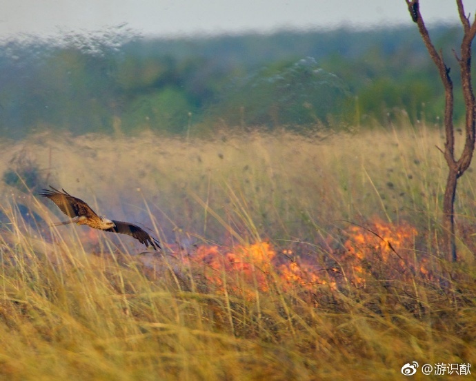 尤森抬头望去,20米外的空中掠过一只啸栗鸢,爪子里抓着根冒烟的树枝。它不慌不忙地将树枝一丢,点起新火,展翅高飞。
