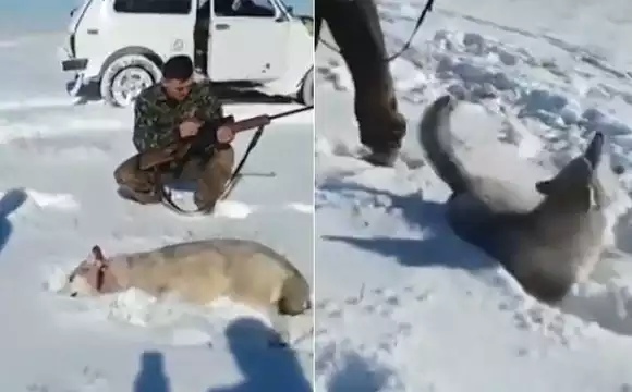 其中一名男子还对这头“死狼”又踢又打,画面显示狼的脖子可能被击中了,有一圈血痕。不过,突然这头“死狼”跳了起来,咆哮着攻击了猎人,把他吓坏了。