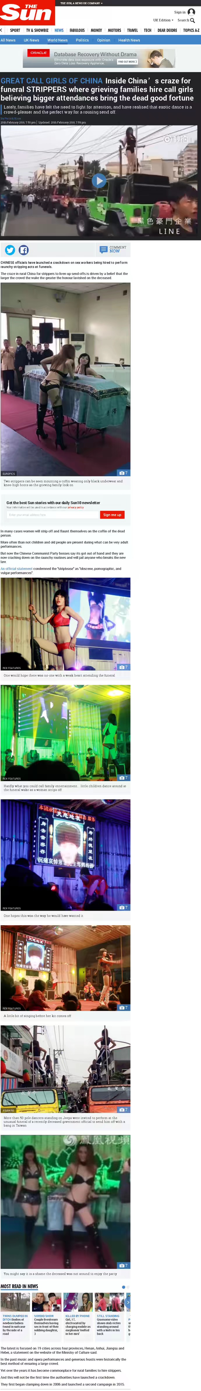 英国《太阳报》21日以“中国应召女郎(GREAT CALL GIRLS OF CHINA)”为题,用文字、图片和视频深度报道了中国部分地区的葬礼脱衣女郎现象。死者家人花钱雇佣应召女郎跳舞,吸引更多人参加葬礼,因为相信更大的场面能给死者带去好运。