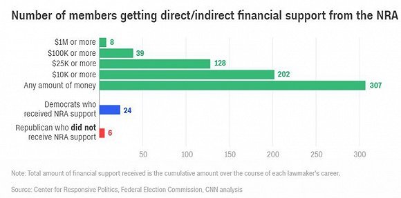 根据CNN新闻最新统计,目前美国国会两院的535名成员中,有307人要么直接从步枪协会及其附属机构处获得过竞选资金,要么就是从协会的广告活动中受益。