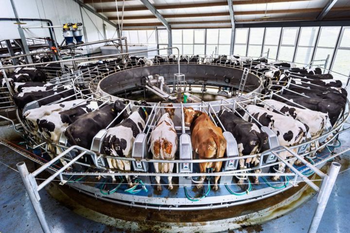 4..荷兰乳牛挤奶流水线。一台自动挤奶机可以在一小时内挤.150.头牛,荷兰乳牛的强大生产力就是这么产生的。荷兰拥有世界上最大的乳品公司菲仕兰康柏尼.Friesland-Campina.公司,以及与英国共有的食品巨头联合利华。