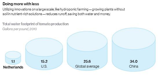 诸如此类,高科技农业虽然并不能让国土局促的荷兰成为世界上最大的农业生产国之一,但让荷兰的投入产出比大大提高。比如荷兰人生产一磅番茄使用的水量是.1.1.加仑,美国是.15.2.加仑,中国竟然高达.34.加仑。