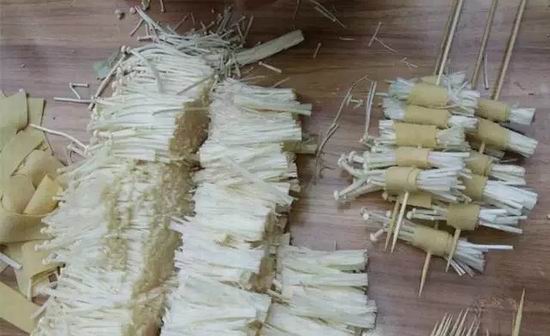菜卷最麻烦了,那豆腐皮卷紧了,再一个个穿上。最快能多久穿一个啊?你啊,那看你手速了,且练吧;