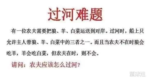 原帖由 Guest from 86.20.182.x 于 2020-9-7 15:00 发表 先送羊过河,再把狼送过河,然后把羊送回来,再送菜过河,最后送羊过河。