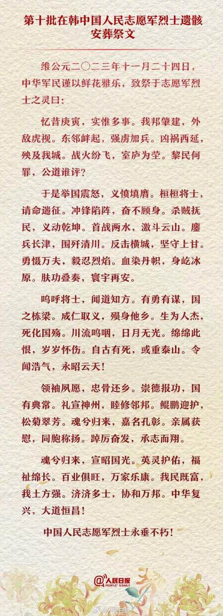 维公元二〇二三年十一月二十四日,中华军民谨以鲜花雅乐,致祭于志愿军烈士之灵曰: