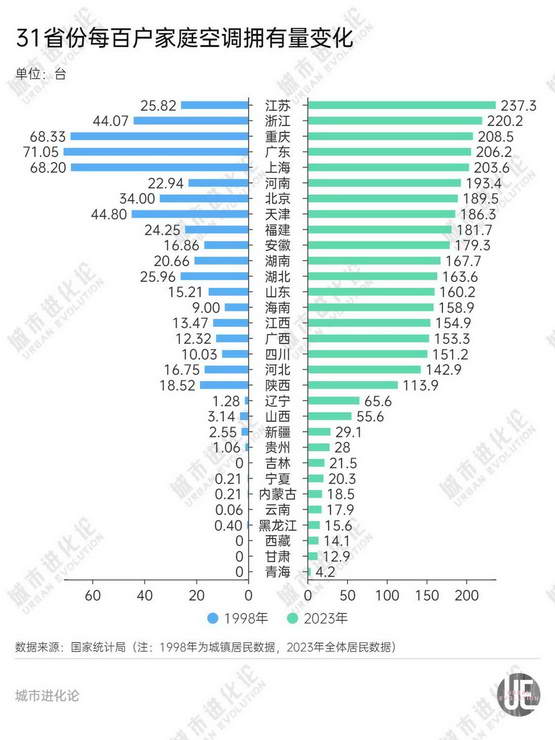 从 1998 年到 2023 年的 25 年间,各省份空调拥有量排名发生了显著变化。1998 年,TOP5 依次是广东、重庆、上海、天津、浙江;而 2023 年,TOP5 变为江苏、浙江、重庆、广东、上海。
