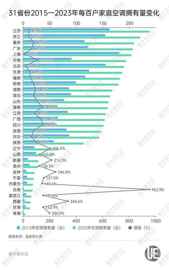 而最近几年,青海、云南、东北、贵州等避暑地,空调拥有量增幅远超全国平均水平,比如云南 9 年间猛增近 10 倍,吉林、辽宁增长均超 2 倍。各地空调数量的变化,一定程度上也反映出气候变化的趋势。