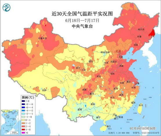 山东烟台、江苏盐城等 11 个国家级气象观测站最高气温突破历史极值;河南遭遇 1961 年以来最热 7 月,局地气温高达 44.4℃;东北地区同样遭遇高温天气,我国最北端城市漠河气温一度超过 35℃……