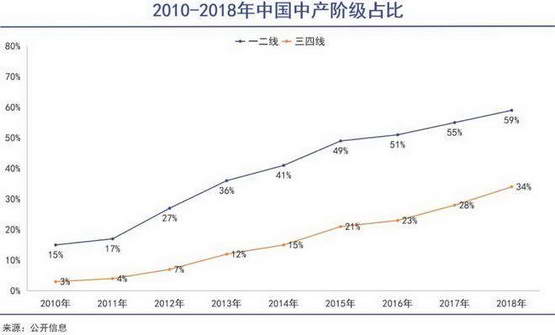 根据麦肯锡发布的《中国消费者调查报告》,我国一二线城市人口中达到中产阶级及以上收入水平的人口从 2010 年的 15% 上升到 2018 年的 59%。正常情况下,这些居民有更强的消费信心,愿意为新型消费支出更多。