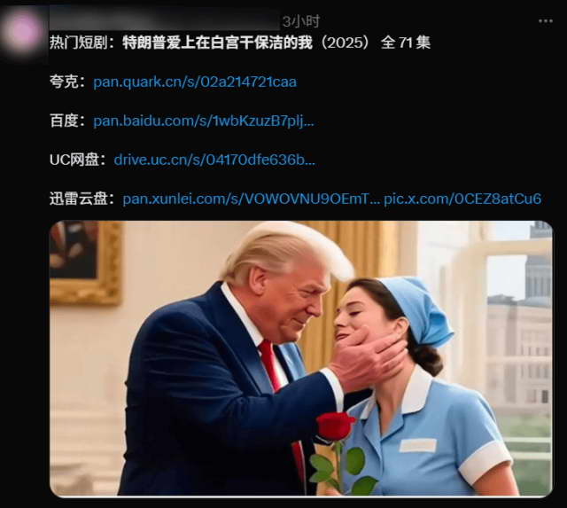 里面明确提到了《 和特朗普离婚后,我分了半个美国 》、《 总统爱上在白宫做保洁的我 》、《 穿越到南北战争成了林肯谋士 》等一系列短剧剧名。