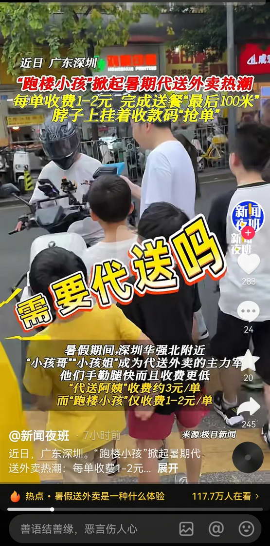 大家可以在抖音上搜下 “深圳华强北小孩外卖代送”。
