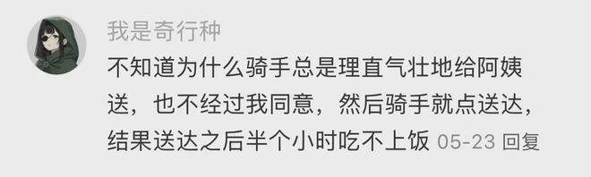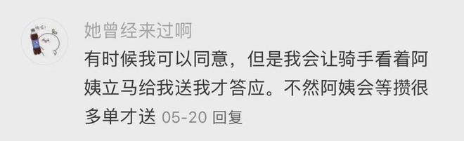 “代送的小学生一单就发车,而阿姨一次要接十来个单子才开始往上送,送到我手里的时候,外卖都凉了。”