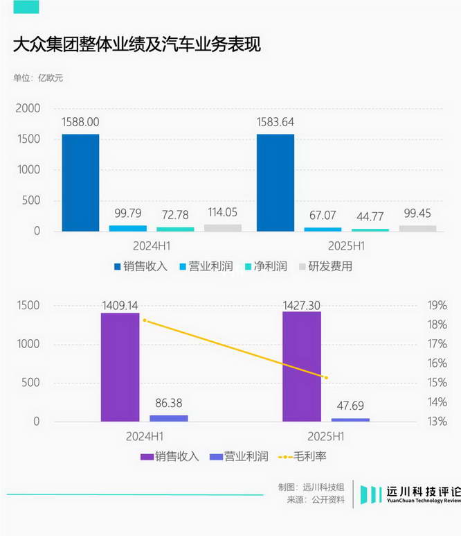 大众集今年上半年收入 1583.6 亿欧元,和去年同期相比,下滑幅度不到 1%,交付量 440 万,同比小幅增长 1%,但营业利润同比下降 32.79%,盈利能力明显走弱。
