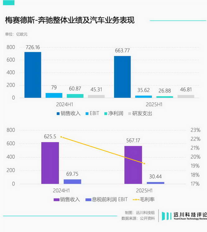 奔驰的业绩最让人揪心,上半年收入同比下滑 8.59%,息税前利润直接腰斩,相比巅峰时期 40 亿欧元的单季盈利水平,奔驰二季度净利润只有 9.6 亿欧元。