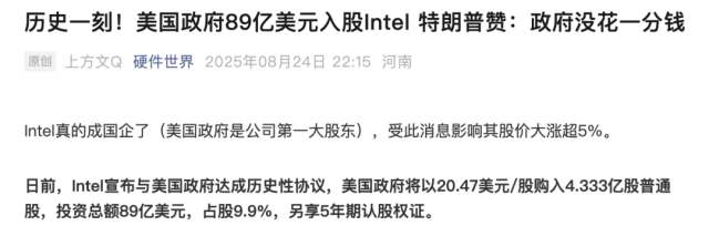 一觉醒来,美国政府用 89 亿美元的投资,正式成为英特尔的第一大股东,英特尔这下真成美国国企了?