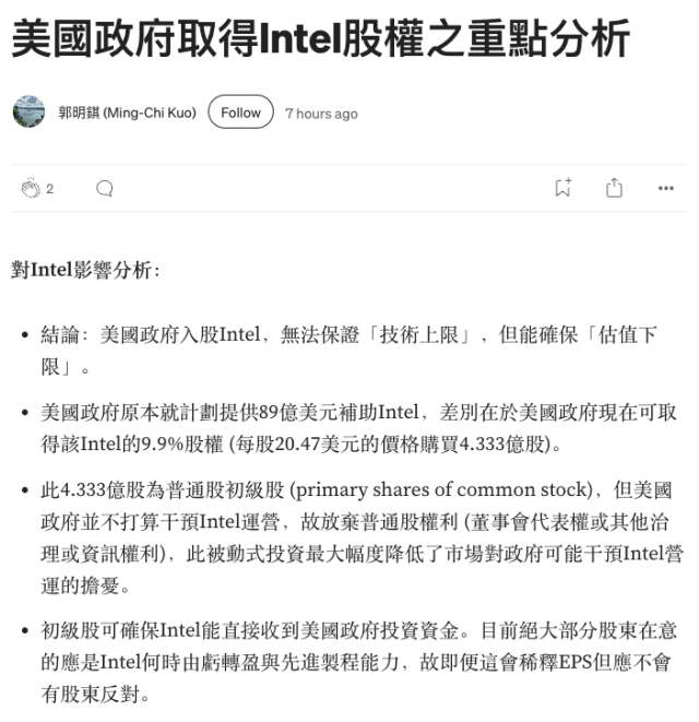 20 美元就意味着,如果英特尔哪天头铁,想放弃制造业,那么美国政府就能以白菜价,再多持有英特尔 5% 的股权。