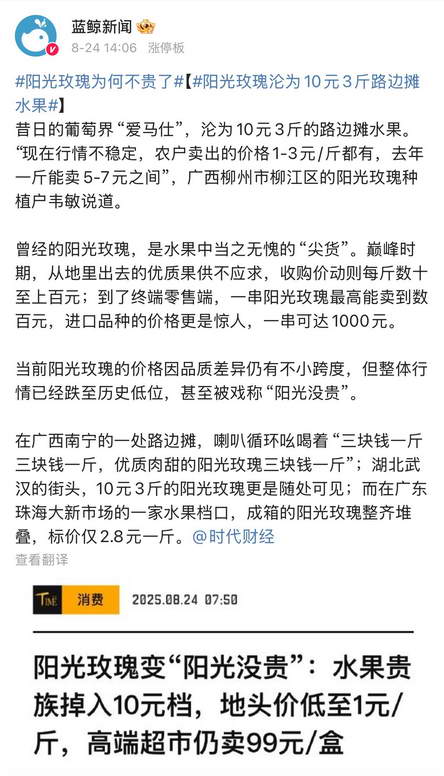 阳光玫瑰原产于日本,国内种植面积和产量,过去十年涨了 10 倍。爱吃的人再多,架不住供应量暴涨。