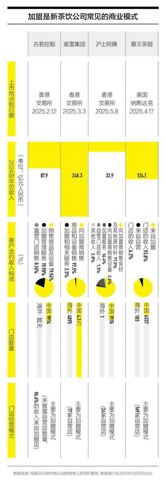 2025 年上半年,新茶饮公司集体上市 —— 霸王茶姬在美国纳斯达克上市,古茗、蜜雪冰城、沪上阿姨相继在中国香港上市。对比这 4 家公司 2024 财年的财报,你会发现,每家公司的加盟商都占总体门店 90% 以上,它们超过 9 成的营收均来自向加盟商销售食品原料、包装、设备和服务。