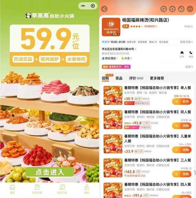 ▲海底捞旗下品牌 “举高高自助小火锅” 小程序首页和杨国福麻辣烫自助小火锅团购价。图 / 小程序 & 美团截图