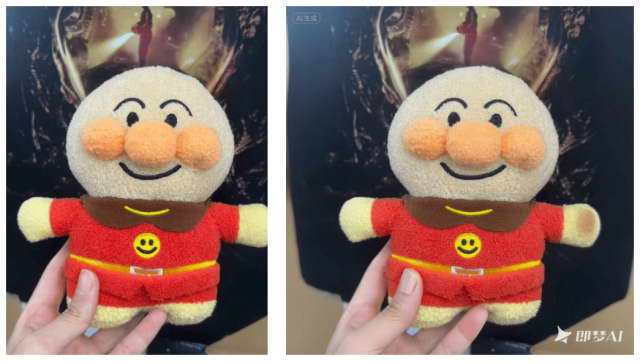 就比如世超随手拍了一个玩偶,然后导入到图片生成 AI 里。输入指令,弄脏手,玩偶手上就多了一块污渍了。