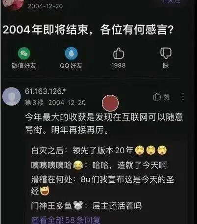 当时面对 2004 年该如何年终总结时,网友就犀利提出:“今年最大的收获是发现在互联网可以随意骂街。明年再接再厉。”