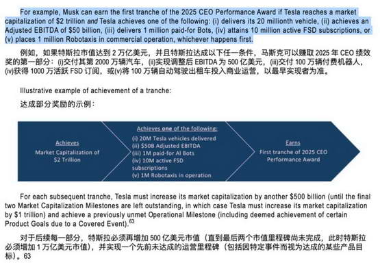 除此之外,马斯克需要完成的运营 KPI 也很夸张:交付 2000 万辆特斯拉汽车、搞定 1000 万份 FSD(完全自动驾驶)订阅、造出 100 万台机器人、投入 100 万台自动驾驶出租车,还得达成一系列调整后的 EBITDA 基准。