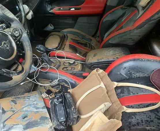 洪水退去后,淤泥留在何敏车内(何敏供图)