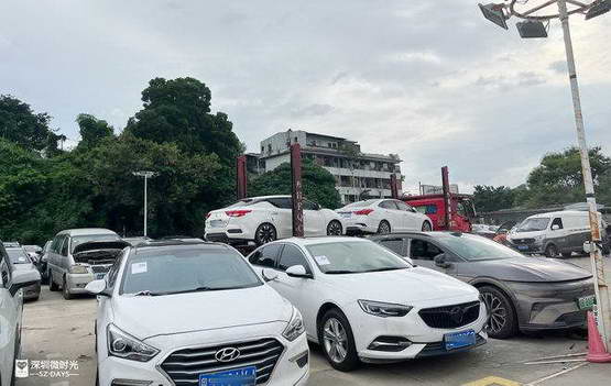 在东莞凤岗,事故车拍卖平台博车网的保全场地,距离深圳观澜只有五六公里,场地也挂着深圳保险行业车辆保全中心的牌子。场地内,三分之一的位置停发着水淹车,这些车辆来自深圳、东莞各个保险公司,其中三四十台挂着粤 B 车牌。拖车在泡水车停放区进进出出,不停地转运车辆。