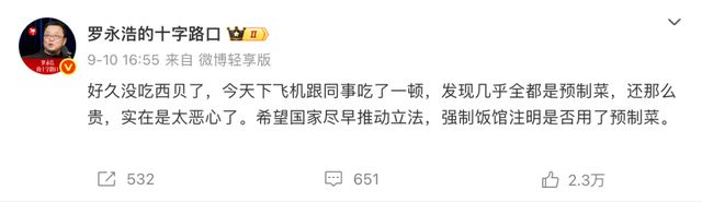 时间回到 9 月 10 日,罗永浩抱怨,下飞机跟同事吃了一顿西贝,“发现几乎全都是预制菜,还那么贵,实在是太恶心了。希望国家尽早推动立法,强制饭馆注明是否用了预制菜。” 有人说,这条颇有信息量的微博,其实是有理解顺序的,本意是罗永浩想告诉大家账还得差不多,终于能坐飞机了,第二是希望预制菜立法,只顺便提一嘴西贝,鉴于罗永浩此前吵架的 “战绩”,被提到的企业,唯一正确的操作就是不理会。