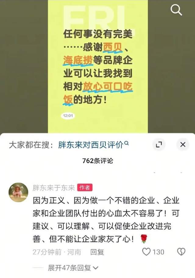 最让人关注的是,胖东来创始人于东来也发文了:“任何事没有完美…… 感谢西贝、海底捞等品牌企业让我找到相对放心可口吃饭的地方。” 作为一向被网友拥簇的良心企业掌门人,这次发言却没了以往的效果,有人质问他:“这是不是意味胖东来也要上架预制菜?”9 月 13 日凌晨,于东来删除了这条抖音,并再次将账号设为私密,网友仍没有放过他,追问道,“你是不是飘了?”“很像我发完朋友圈没人给我点赞就破防删除、屏蔽的样子。”