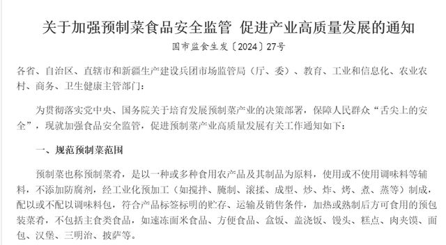 但实际上,目前餐饮业对预制菜的判断,是有一定标准的。2024 年 3 月,市场监管总局等六部门联合印发《关于加强预制菜食品安全监管 促进产业高质量发展的通知》,第一次在国家层面明确了预制菜的定义和范围,并提出大力推广餐饮环节使用预制菜明示。