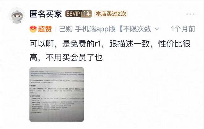 “可以啊,是免费的 r1,跟描述一致,性价比很高,不用买会员了也。”