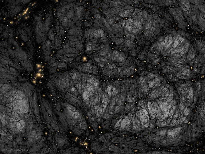 计算机中的宇宙物质分布,蛛网状的暗物质结构上点缀着星系。Dark Matter in a Simulated UniverseIllustration Credit & Copyright: Tom Abel & Ralf Kaehler (KIPAC, SLAC), AMNH