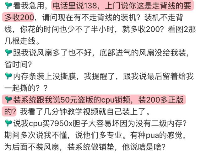 还有网友在电话里说好 138 装机,上门就变成 “走背线加 200”。