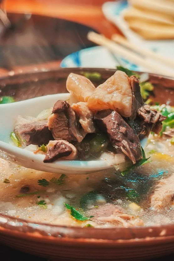 和北京人有同样秋日羊肉执念的还有辽宁人。当关门山的枫叶染上红色,大批辽宁人便开始驱车前往本溪小市,观赏红枫也品尝小市羊汤。本溪羊汤风格偏向醇厚,汤底颜色偏白,羊肉烂而不柴,羊杂口感丰富,吃的时候撒上一把香菜,再配个花卷,喝得满头大汗,通体舒泰,是当地人抵御秋寒的日常智慧。