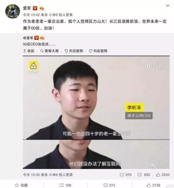 很多“三四十岁”的老一辈企业家们,看到这句话就中年危机了,一下子就觉得自己真的不懂互联网了。杰出的老一辈企业家代表雷军同志还转发了这条视频的微博:“个人觉得压力山大,长江后浪推前浪,世界未来一定属于00后,加油!”