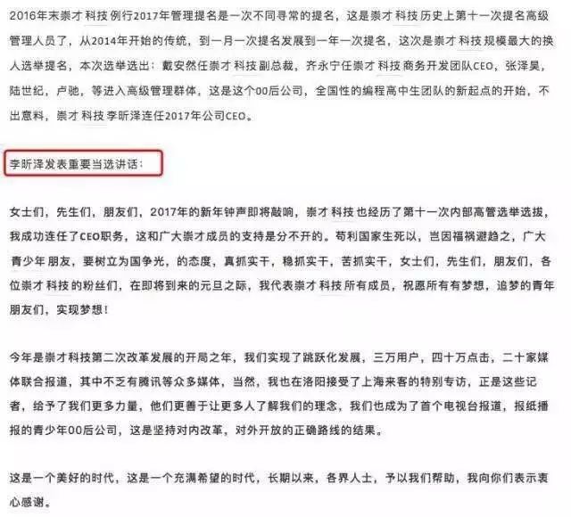 再看看他的其它言论:“我们公司有300多个人,都是通过QQ联系”、“对00后来说,崇才就是苹果一样的存在”、“老罗是大忽悠,我是二忽悠”……视频和文章都有,各位自己慢慢看。