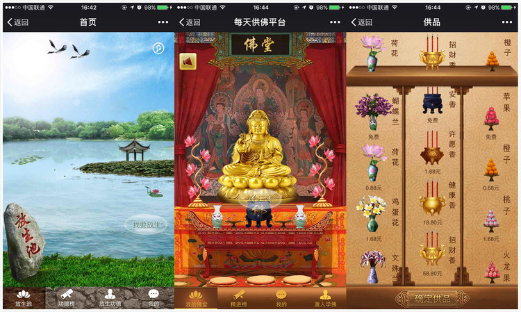 另据《法制晚报》的调查,还有些礼佛帐号真的会与线下寺院有合作。比如一个叫“菩萨在线”的公众号,就和上海报国寺有商务合作,用户购买礼佛用品所花的钱,会按原价即时转到寺院账户。但这其中也有问题,用户在微信付费礼佛时,可以选择供奉不同的神佛,但这并不意味着它会和寺院中一一对应,寺院与公众号的费用也是按年结清。所以,即使有和线下寺院合作的公众号,采用的也是很粗放的方式。