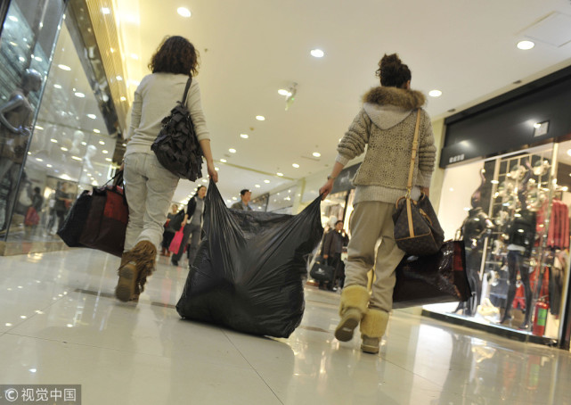 (2011年12月,两位顾客在海宁中国皮革城内满载而归。)