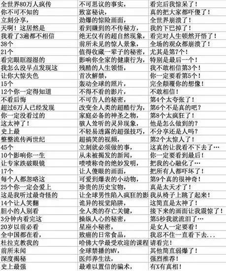 要求:列出你认为UC震惊部出品标题中,不可缺少的关键词,每个词语得1分,多多益善。