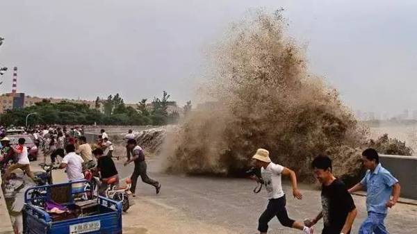 2.钱江大潮冲过堤坝照片: