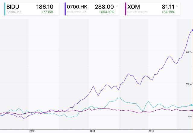 2011-1-1至2017-6-27百度、腾讯、埃克森美孚的股价走势