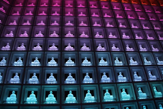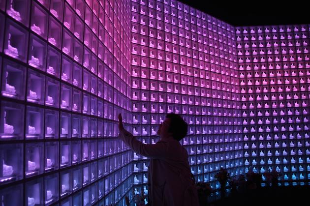 琉璃殿里摆满了2045个LED佛像,分布在墙壁四周。每一尊佛像都放在一个透明的水晶盒里,有的已经放入逝者的骨灰,有的尚未正式启用,等待着中岛这样的访客决定将自己的骨灰放入墙后的骨灰盒里。只要刷一下配套的智能卡,相应的佛像就会闪耀不同的光芒,方便访客寻找。
