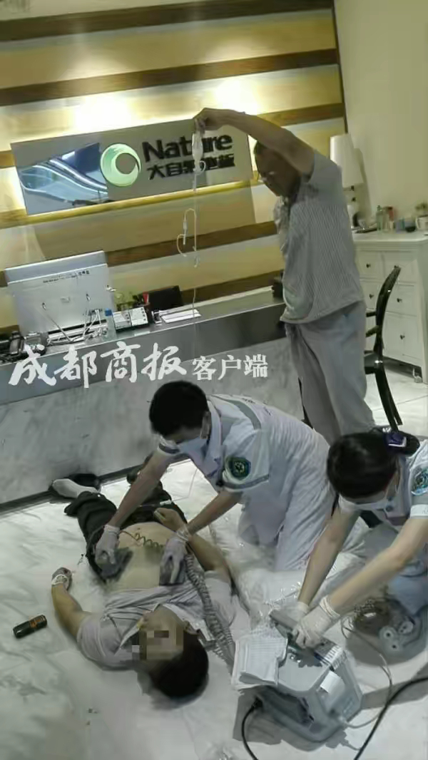 袁建华说,她把先生扶在旁边的沙发半躺着,导购员拨打了120,10分钟后,急救医生赶到现场,对黄世东进行了半个多小时的抢救后,送往成都城北医院,下午5点14分,家属被告知病危,立即将黄世东转到成医附二院·核工业四一六医院。次日上午10点30分左右,黄世东在四一六医院不治身亡。
