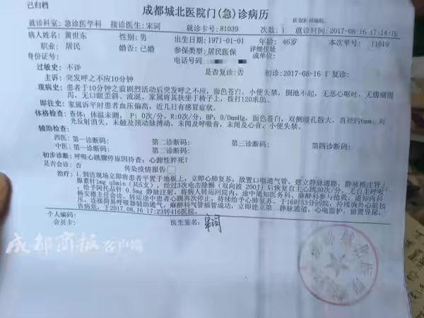 成医附二院·核工业四一六医院的出院证明书显示,10分钟后城北医院急诊科到达现场后发现患者呼吸、心跳停止,血压测不出,立即进行急救,虽然经过一系列的抢救,但是患者依然持续深昏迷,氧合差,循环不能维持,严重代谢性酸中毒,无尿,肝功能不全,凝血功能异常,家属决定放弃进一步治疗。“当时医生跟我们说,意识缺失4分钟基本上就没有救了,所以我们决定放弃治疗。”袁建华说,10点半左右,黄世东被宣告死亡。