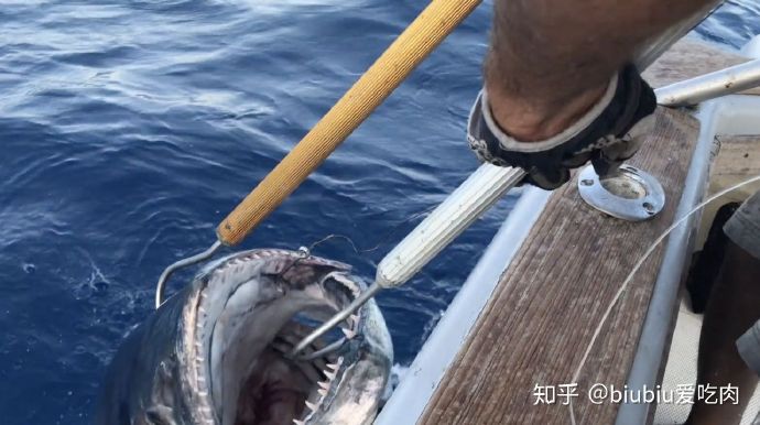 结果没刺中,金枪鱼趁着靠近船边的时候用身体和船舷摩擦鱼线,逃出升天了